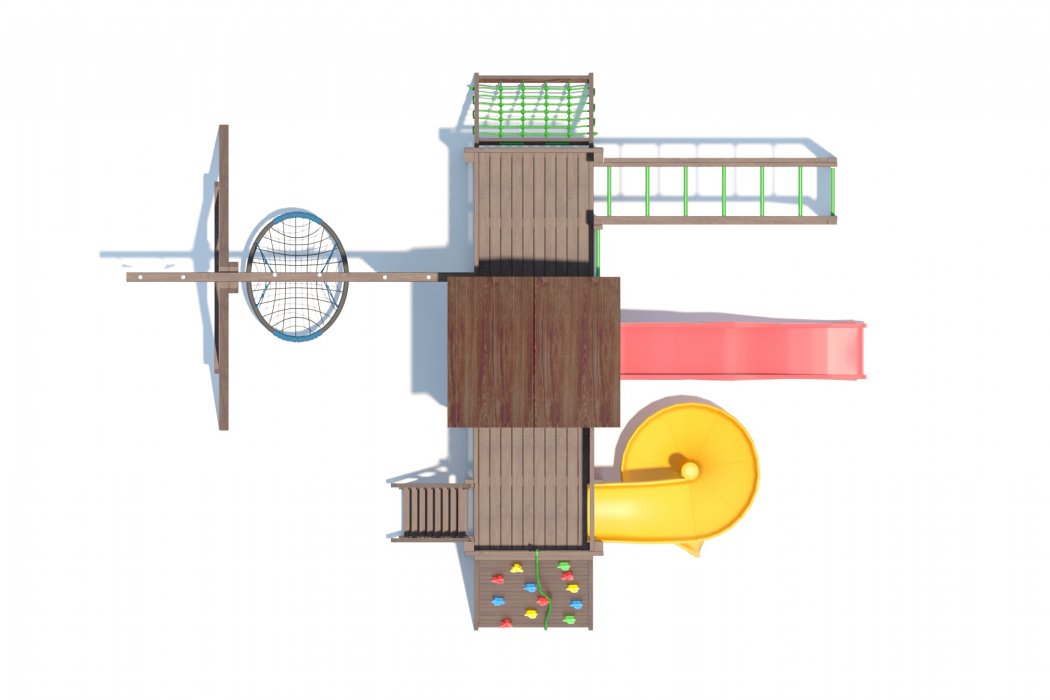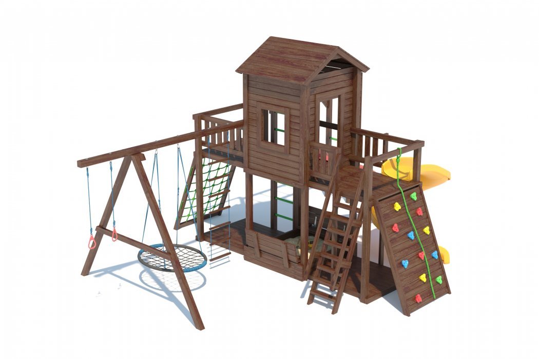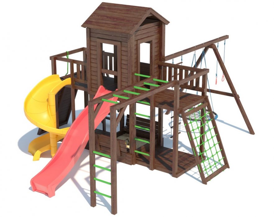 Основа детской игровой - спортивной конструкции - башня с террасой и игровой платформой. Конструкция оснащена двускатной деревянной крышей, встроенным домиком в верхней части конструкции, встроенной песочницей с крышкой «трансформер» в нижней части конструкции, дополнительной платформой в основании конструкции, пластиковым волнообразным скатом и винтовым скатом с превосходной скользящей поверхностью, деревянной лестницей, широким скалодромом, канатной лестницей, деревянным рукоходом, шведской стенкой, приставными качелями, сидением качели «гнездо», сидением качели «малютка», гимнастическими кольцами, подвесной лестницей. Для безопасности ребенка предусмотрены перила на лестнице, заборчики и ограждения над зонами препятствий (скалодром, канатная лестница, скат).