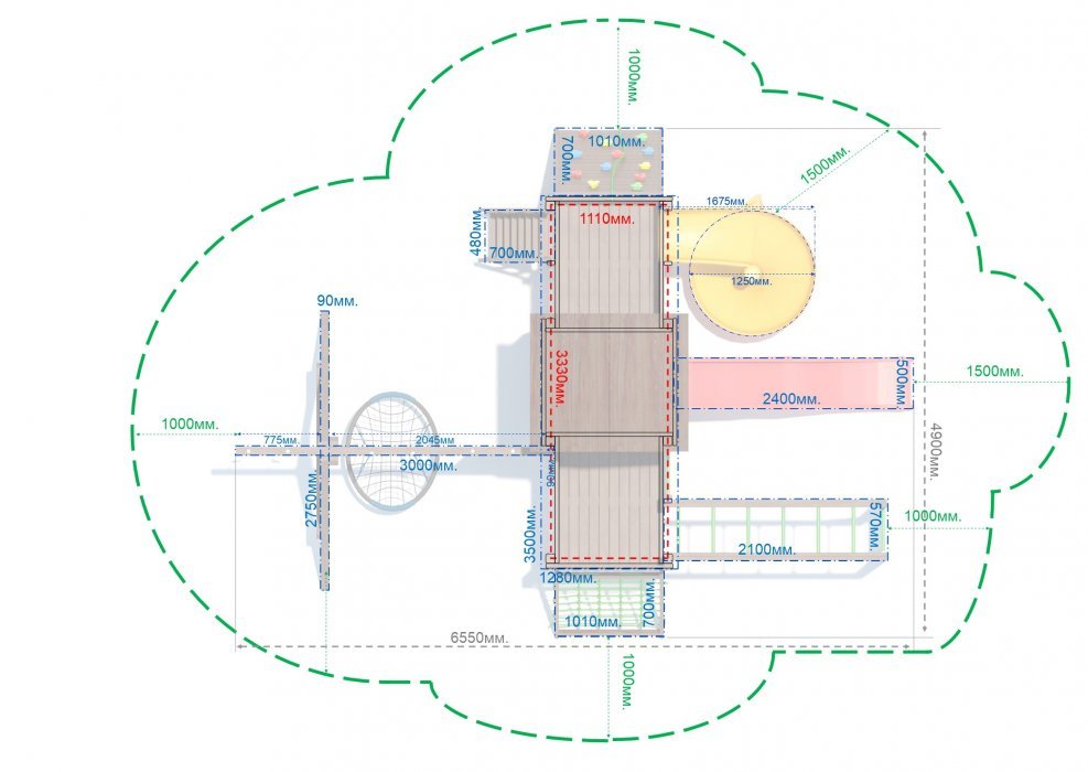 Площадь поверхности детской площадки = габариты конструкции по крайним точкам + 1000/1500мм. по периметру конструкции. Поверхность должна быть твердой, ровной, свободной от насаждений, горизонтальной без перепадов, допустимый уклон не более 20мм. на 10п.м.