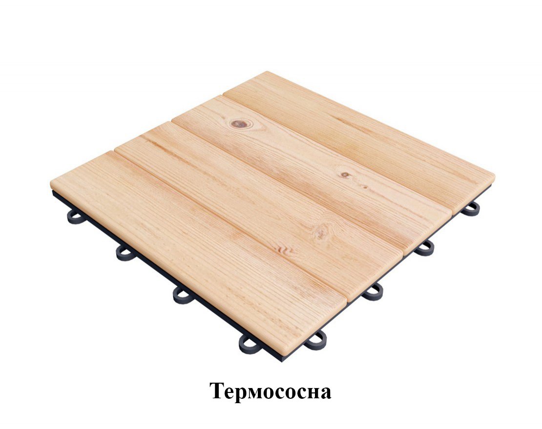 Садовый паркет формируется из небольших плиток. Каждый элемент состоит из пластиковой основы и закрепленной на ней планки из древесины. Сосна/берёза обрабатывается теплом и паром без применения химических составов.