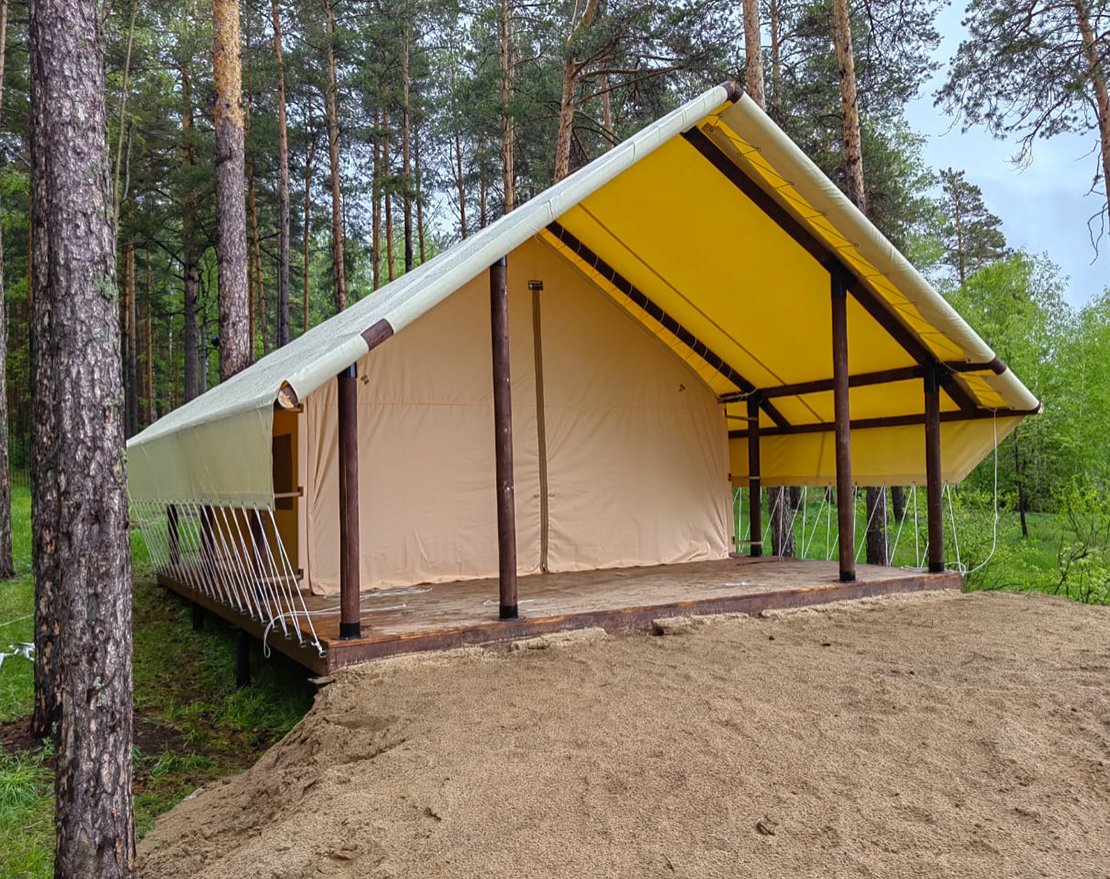 Сафари-тент — это комфортная палатка для глэмпинга, вмещающая от 1–2 до 4–6 человек. Представляет собой конструкцию на основе деревянного или металлического каркаса с двускатным навесом из ткани ПВХ и палаткой из износостойкой ткани Оксфорд , покрытие выдерживает температуру от -50°С до +70°С.